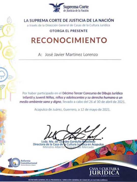 El director general del Colegio de Bachilleres del Estado de Guerrero, Fermín Alvarado Arroyo, felicitó a nombre del Gobernador Héctor Astudillo Flores, al alumno José Javier Martínez Lorenzo, por haber obtenido el segundo lugar del 13° Concurso de Dibujo Jurídico Infantil y Juvenil 2021, convocado por la Dirección de Casas de la Cultura Jurídica, de la Suprema Corte de Justicia de la Nación.