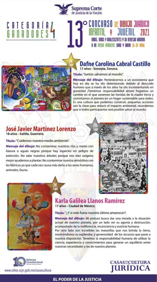 La Dirección General de Casas de la Cultura Jurídica convocó a este concurso nacional a distancia, con el tema “Niñas, Niños, Adolescentes y su Derecho Humano a un Medio Ambiente Sano y Digno”, con el objetivo de promover el cuidado del medio ambiente, crear conciencia y generar acciones que eviten su deterioro.