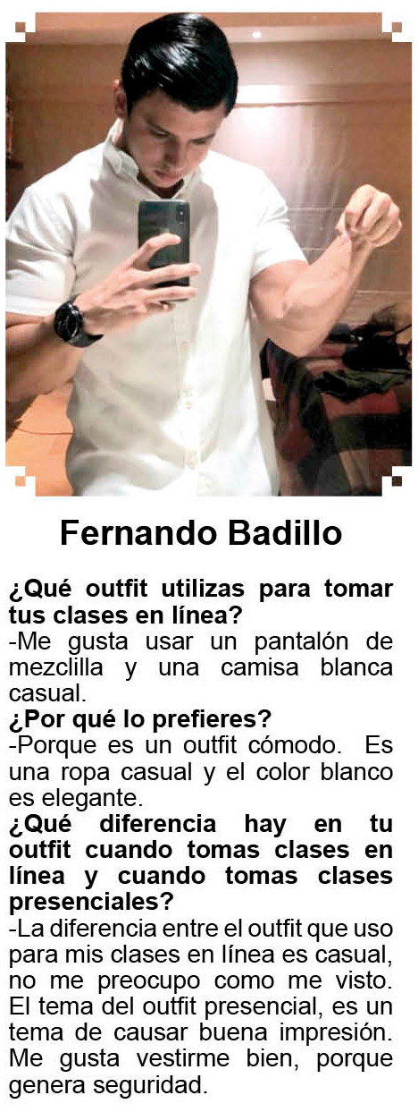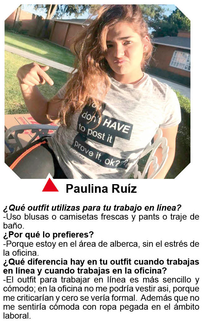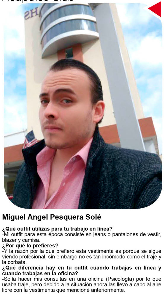 Pero también sabemos que no todo es descuidarse, por lo que quisimos averiguar cuál es el outfit que algunos amig@s usan en estos tiempos que deben de estudiar o laborar a distancia y aunque diversas las opiniones la mayor parte coincide en buscar piezas cómodas, casuales, con un toque de elegancia o al extremo de usar traje de baño por vivir en un lugar como Acapulco.