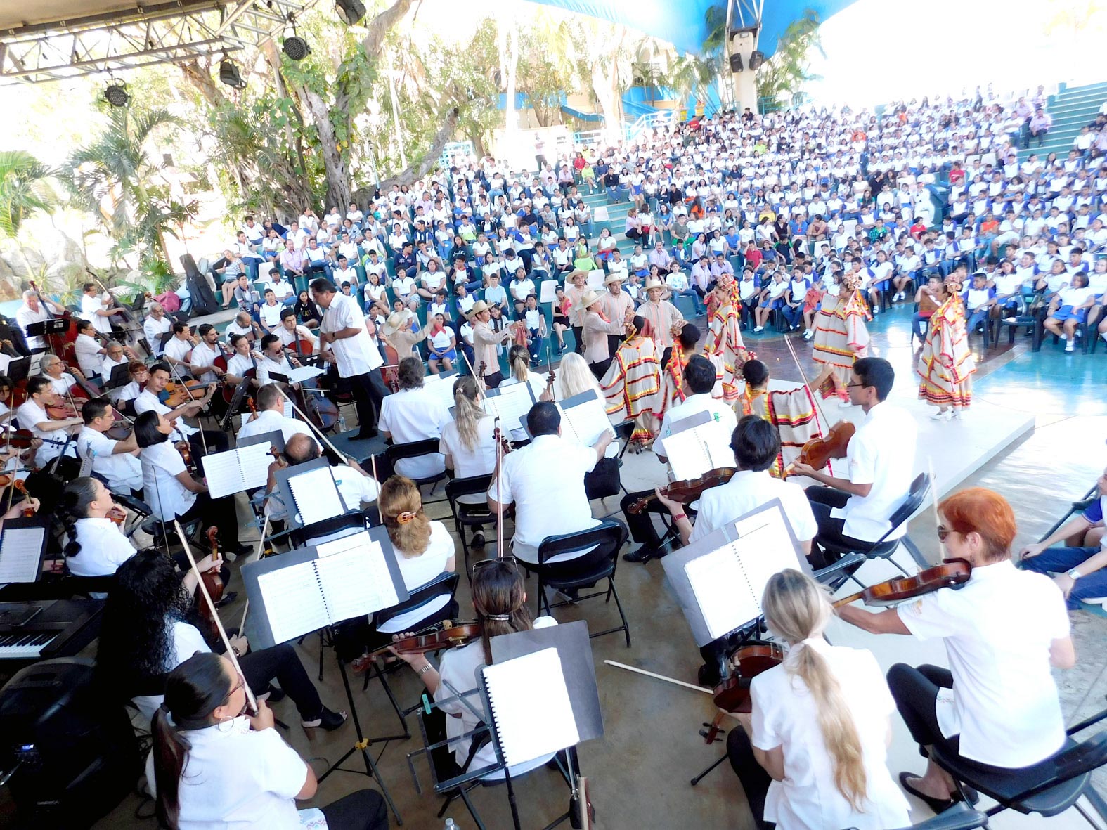 Una vez más, el Ballet Malintzin de la UAGro, que dirige la Maestra Verónica Hernández acompañó a la OFA en el concierto didáctico para enseñar a los estudiantes el ensamble de la música con la danza, al igual que el folklore y la cultura del estado de Guerrero así como de sus regiones.