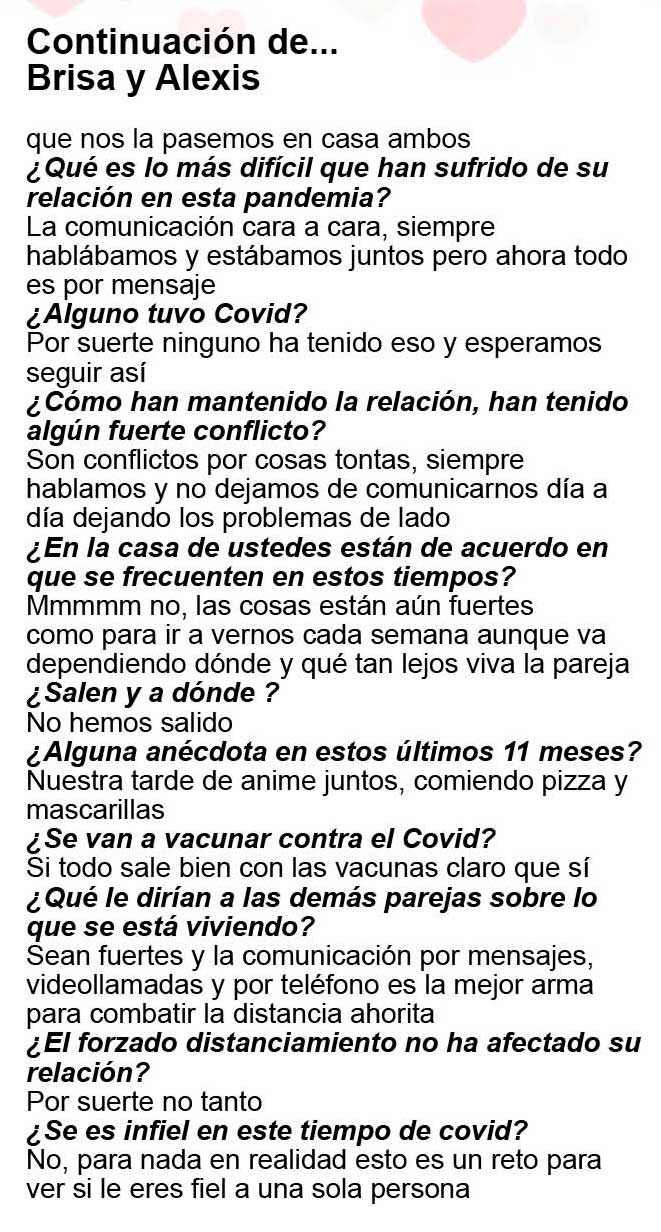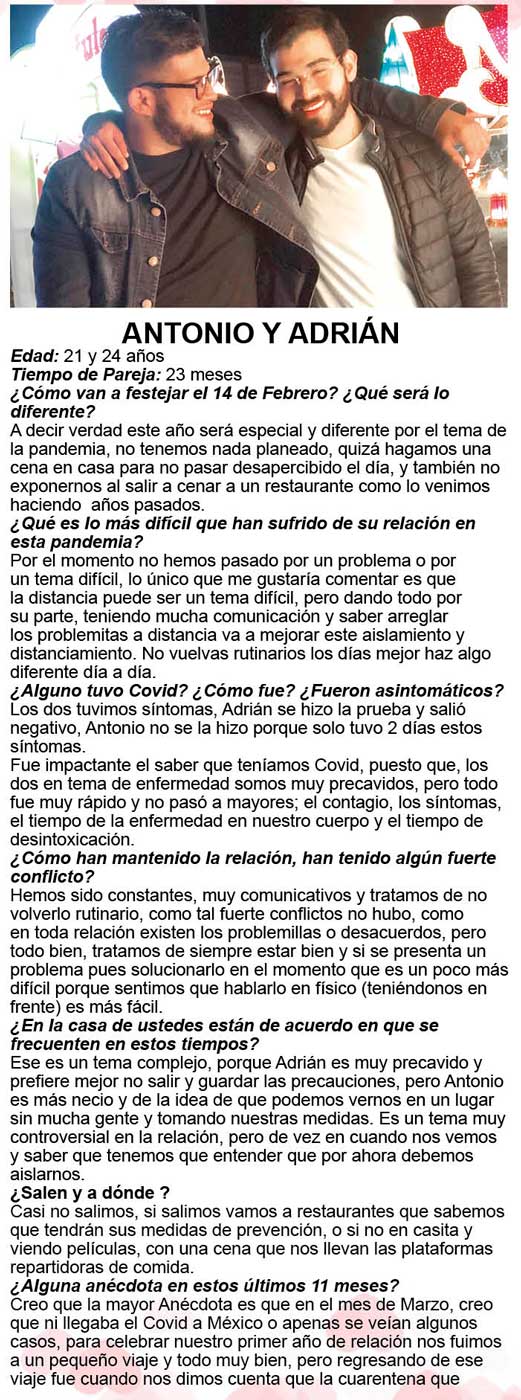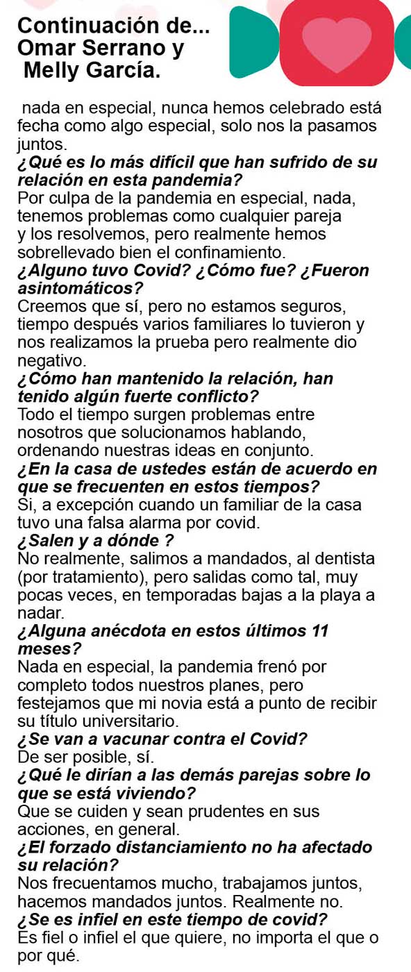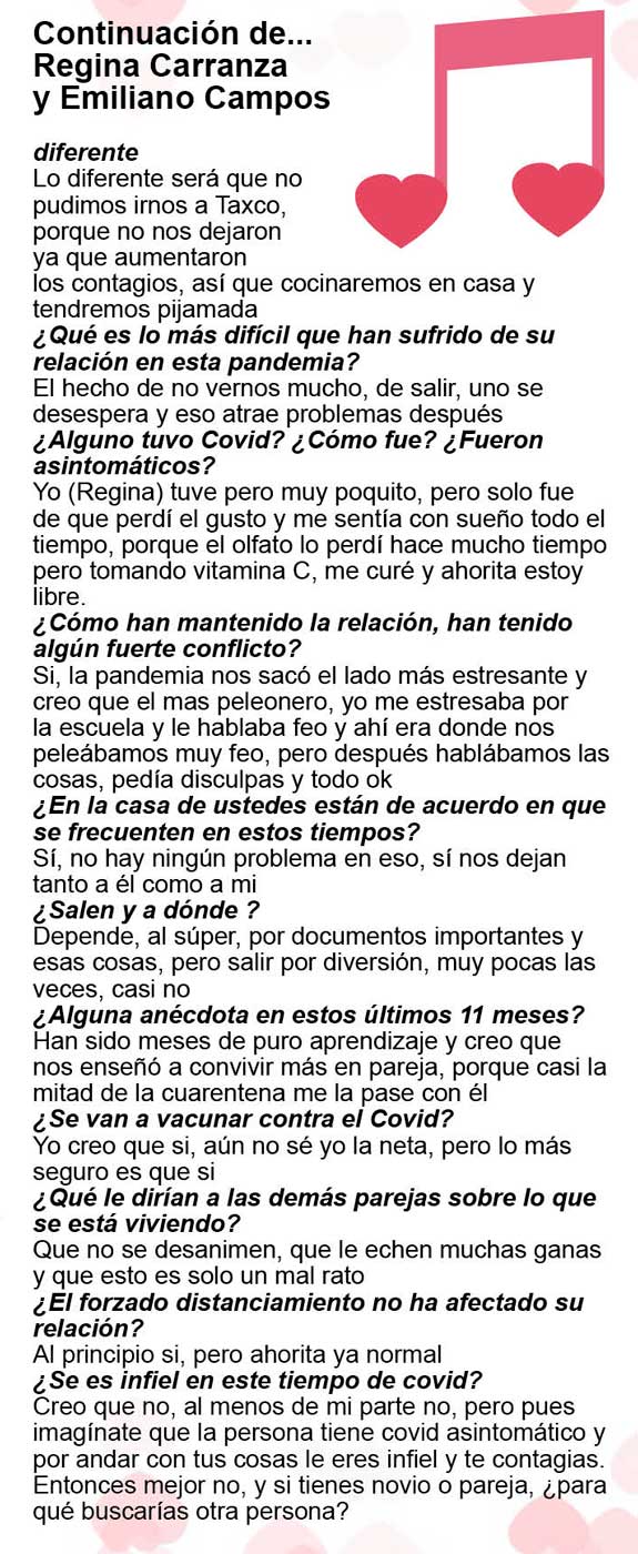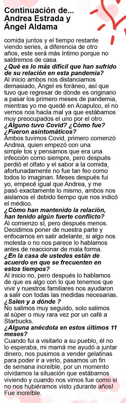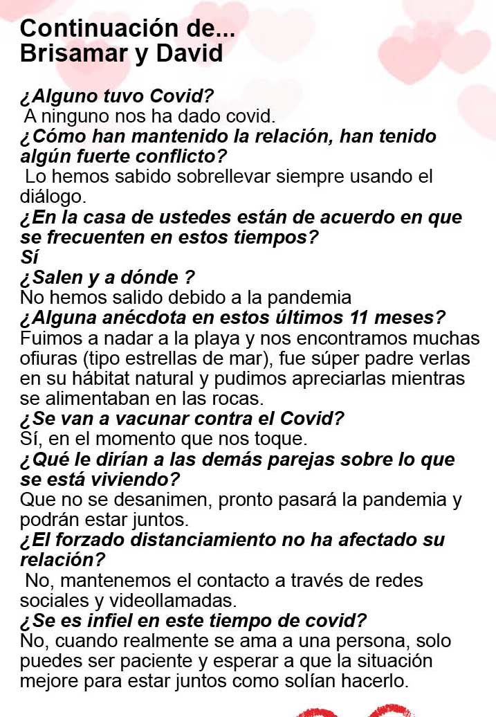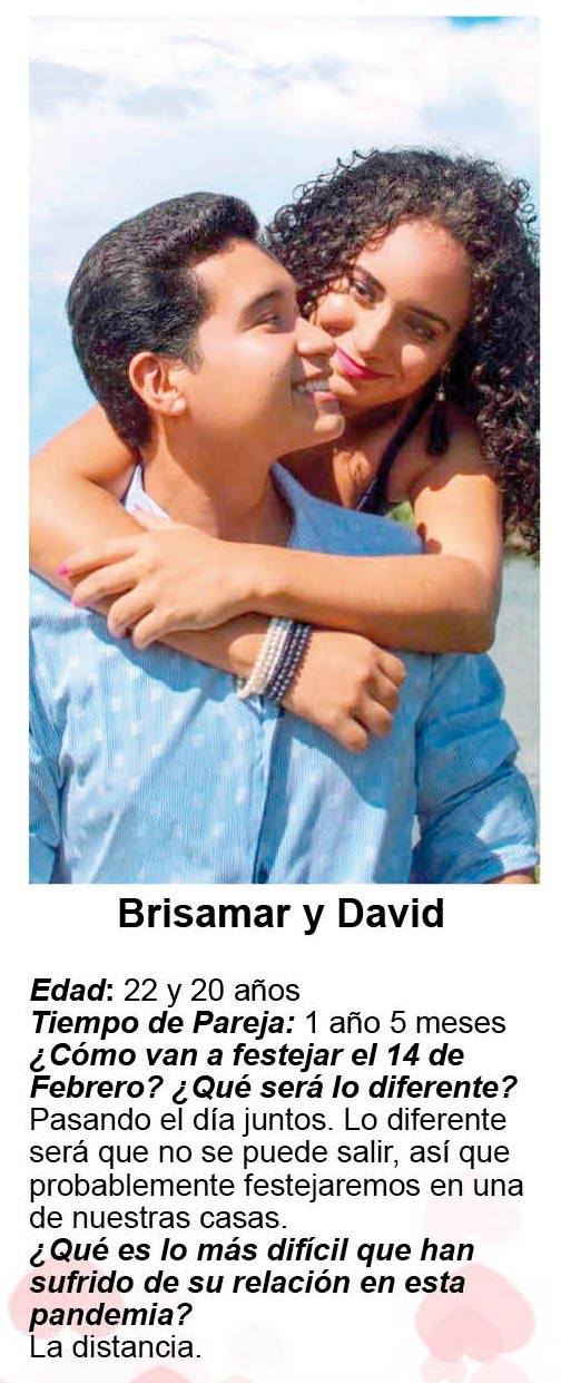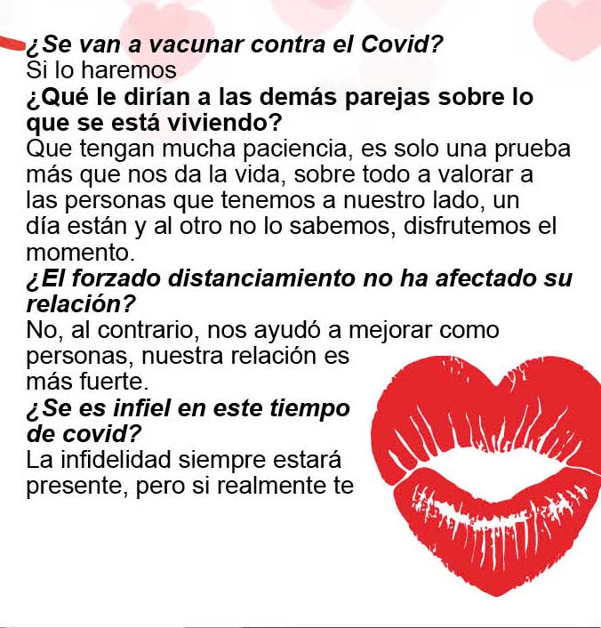 Nuestras corresponsales Ely Ramírez, Katinka Pinto y Ximena Vargas lograron que varias parejas nos platicaran sus planes para esa fecha y además nos dijeran cómo se la han llevado en su relación, cómo es el amor en tiempos de coronavirus… y esto es lo que nos platicaron: