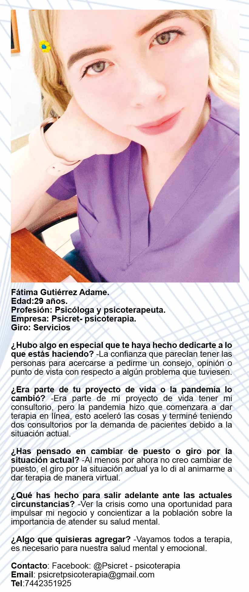 Edad: 29 Profesión: Lic. Diseño y Mercadotecnia en Moda Empresa: Emarine Collection Giro: Moda