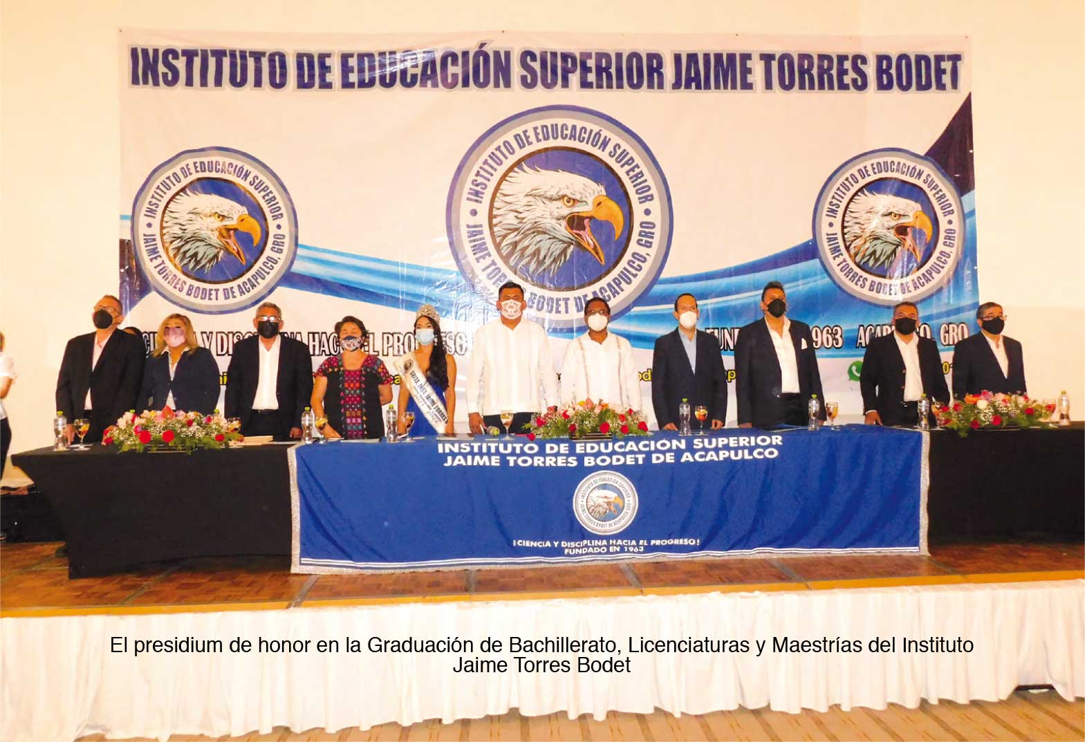 En el presidium estuvieron diferentes personalidades, por el IES Jaime Torres Bodet: Mtro. Eurípides Astudillo Director General, Mtro. Ulises Astudillo SubDirector General, Mtro. Juan Carlos Astudillo Jefe de Contraloría, Mtra. Li- liana Herrera Subdirectora Académica, Abril Ivana Alvarado Srita JTB; así como Mtro. Mauricio Leyva, Vicepresidente de la Confederación de Grandes Logias Regulares de México, entre otros. El Mtro Marco Antonio Marbán Galván, subsecretario de Educación Media, Media Superior y Superior, representante de la Gobernadora Evelyn Salgado Pineda, fue quien clausuró el acto protocolario de terminación del ciclo escolar.