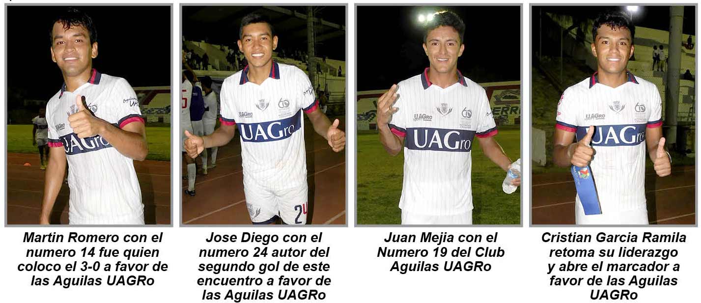 Tras venir de un encuentro complicado con los avispones de Chilpancingo las Aguilas UAGRo, retoman el vuelo como locales Cristian Garcia que tras su castigo que lo llevó a no estar presente en este Clásico Guerrerense retoma su lugar como líder y mete el primer Gol al Minuto 2, Cristian Garcia Rámila con el Numero 10, coloca el primer tanto para así colocar el 1-0 a favor de las Aguilas UAGRo.y tras varias llegadas sin definir las Aguilas con José Diego con el numero 24, al minuto 48 del Primer Tempo anota el segundo tanto para así llevar el 2-0 a favor de las Aguilas UAGRo. Martin Romero Inicia una transición en conjunto con Cristian Garcia el cual culmina Martin Romero con el numero 14 al minuto 28 de tiempo complementario para poner el 3-0 a favor de las Aguilas UAGRo. para así llevarse los 3 puntos del encuentro.