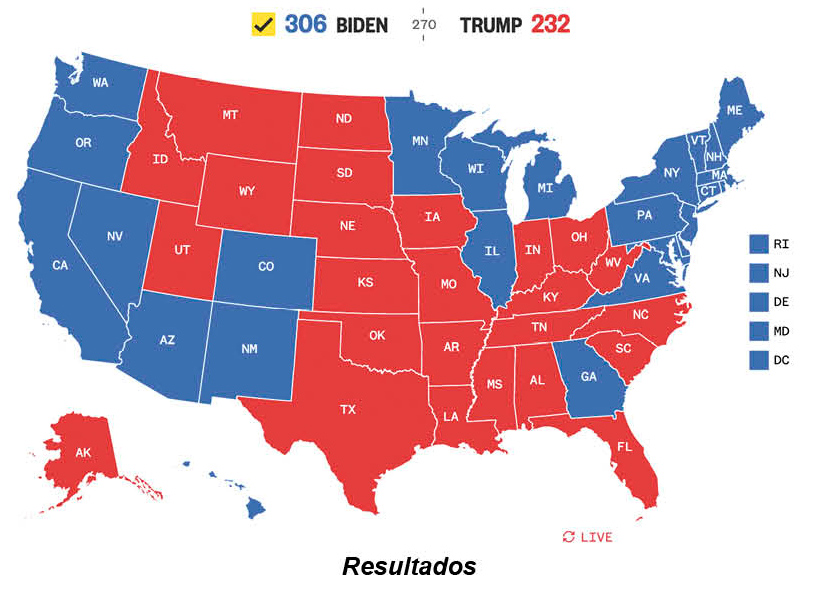Estados Unidos es un país que usa un modelo de Colegio Electoral, es decir que los ciudadanos NO están votando directamente por su candidato preferido, están votando por quien votará su Estado. El partido que gane la mayoría de votos en sus respectivo Estado toma todos los votos que representa este territorio. Es decir que si (como ocurrió en esta elección) en un Estado vota el 49.5% por Joe Biden y el 49.2% por Donald Trump, la totalidad de los votos electorales de este Estado se van para Joe Biden. Este es el ejemplo de Georgia, y sus 16 votos electorales fueron decisivos para la elección.