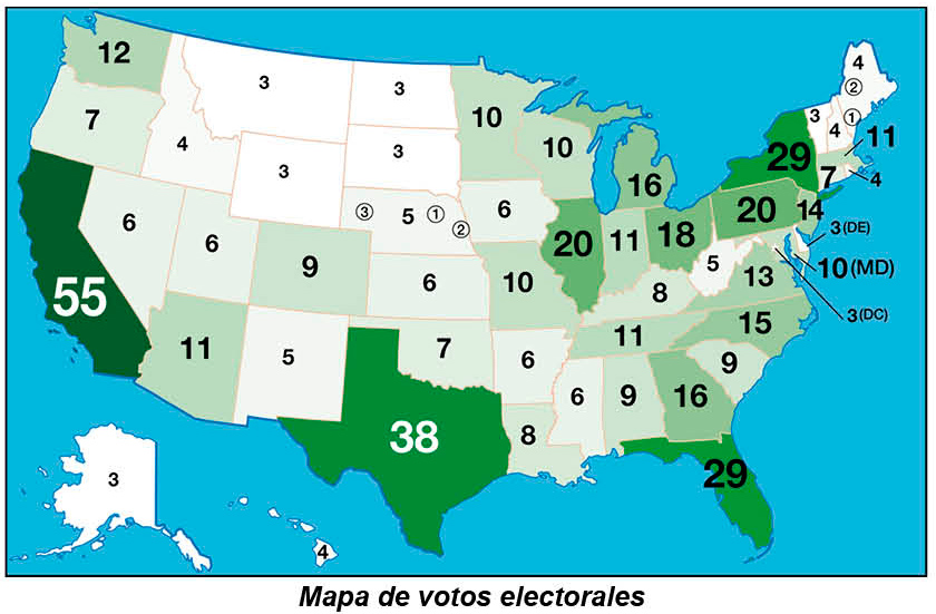 Dependiendo de su población, cada Estado tiene cierto número de Representantes en la Cámara de Representantes de los Estados Unidos, número que puede cambiar cada 10 años con el censo. A este número equivalente a su población se le agregan 2 votos electorales representativos a sus Senadores, que son 2 por Estado, y hay 3 que representan a Washington D. C., que se administra como Distrito Federal en lugar de Estado. Así es como el número mínimo de votos electorales es 3 para los más bajos en población y 55 para el más alto, California. Hay 538 votos electorales a ganar en la elección, y de estos quien llegue a 270 se considera ganador.