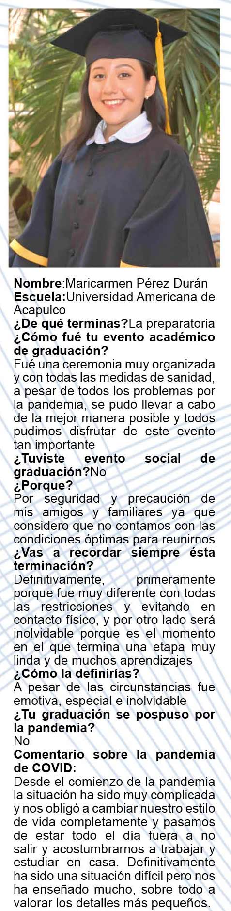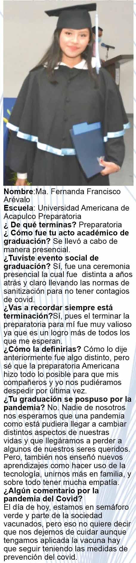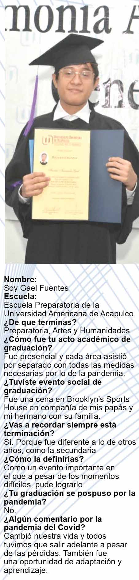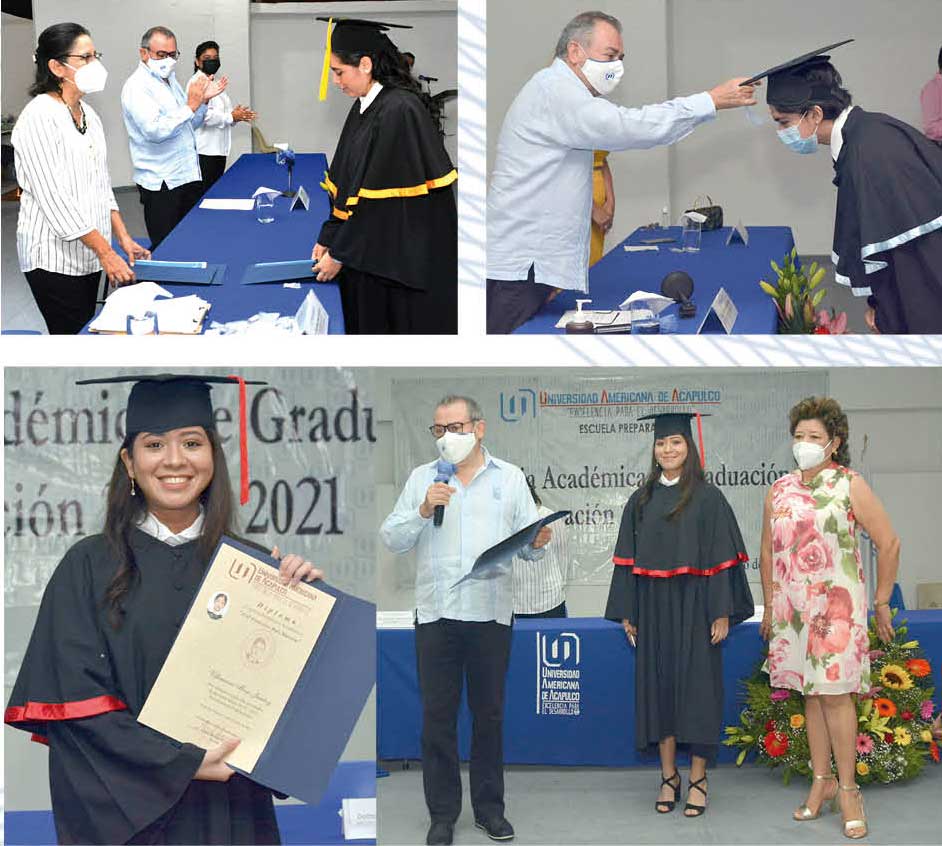 La preparatoria de la Universidad americana de Acapulco llevó a cabo su ceremonia de graduación de bachillerato ciclo escolar 2018- 2021, la cual se realizó de manera gradual, en cuatro eventos, a fin de garantizar se cumplieran con las medidas sanitarias y de sana distancia. En dicha ceremonia, se les hizo entrega de Diploma por haber concluido sus estudios en el nivel Bachillerato con incorporación a nuestra Máxima Casa de Estudios en el país, la Universidad Nacional Autónoma de México, quien a través de la Dirección General de la Escuela Nacional Preparatoria, otorgará los certificados de estudios, que los acreditan con el grado de Bachiller, de la institución educativa más importante de México, y dentro de las 100 instituciones educativas mejor calificadas del mundo. También recibieron la Certificación de Inglés TOEFL, Certificación Microsoft en programas de computación y reconocimiento a los alumnos de alto rendimiento académico.