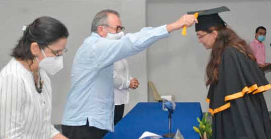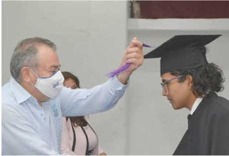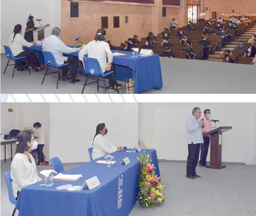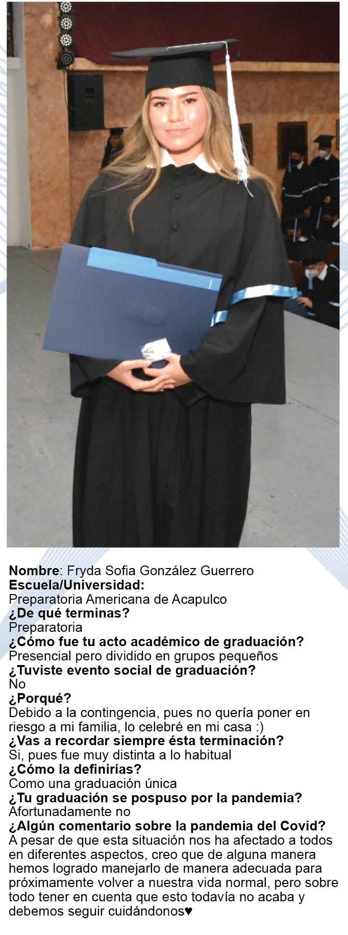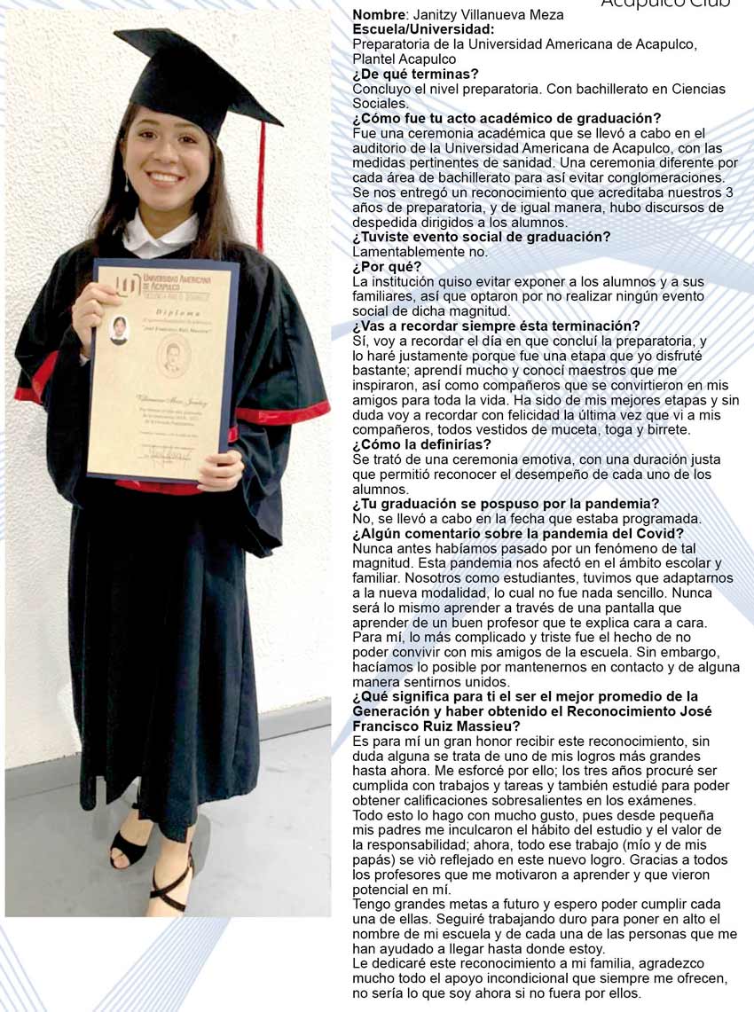 En el presídium estuvo imponiendo el grado de bachiller, el Dr. Mario Mendoza Castañeda, Rector de la Universidad Americana de Acapulco, quien destacó su agradecimiento a los padres de familia por su confianza en la institución, así como a los maestros que fueron los pilares para poder llevar esta educación de calidad a distancia a sus hijos y al maestro Leobardo Castañeda por su atinada dirección. La alumna Janitzy Villanueva Meza recibió el Reconocimiento José Francisco Ruiz Massieu por haber obtenido el mejor promedio de la generación y quien brindó el mensaje a nombre de los alumnos de la generación y en la ceremonia del área tres Ciencias Sociales. Por otro lado, se tuvieron las participaciones de los alumnos por el área uno de Ciencias Físico Matemáticos por el destacado alumno Genaro Alfonso Rivero Juárez, en el área dos de las Ciencias de la Salud por la destacada alumna Leticia Denisse Maldonado Vergara y en el área cuatro la destacada alumna Marianna Guadalupe García López.