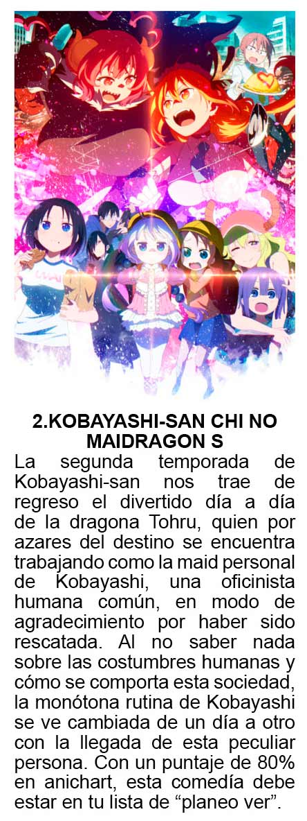 Con una calificación del 84% en anichart, esta segunda temporada de Tensei Shitara Slime Datta Ken relata las aventuras del solitario Satoru Mikami que renace como una bola de slime tras morir a manos de un ladrón, lo que le da un nuevo comienzo en un mundo de fantasía. En esta ocasión, debido a que la Alianza Juria Tempest ha crecido en su poder, el protagonista junto a su equipo deberán reunirse con el reino animal Eurazania, en medio de la latente tensión entre humanos y monstruos.